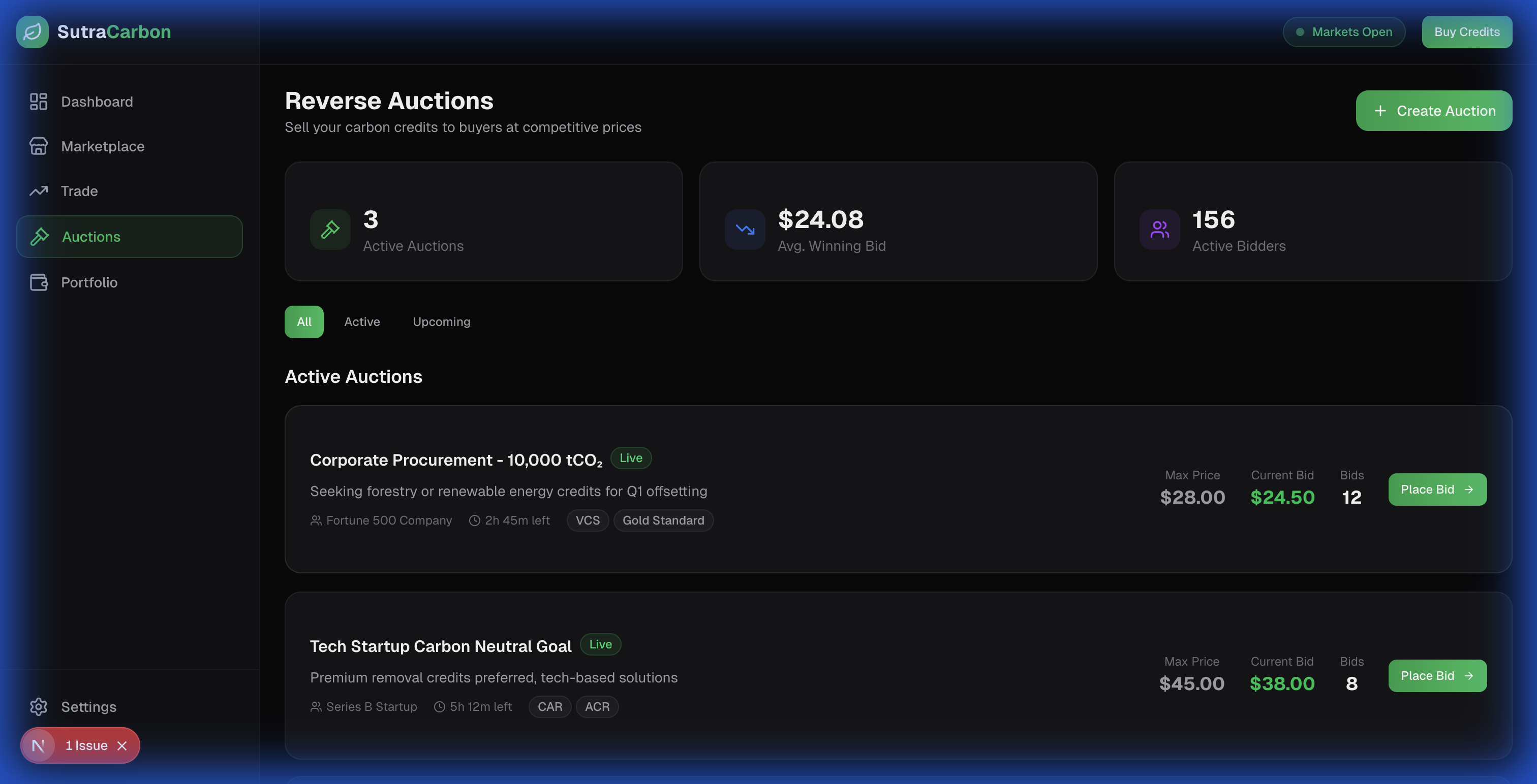 Participate in bulk carbon credit auctions with transparent competitive bidding.