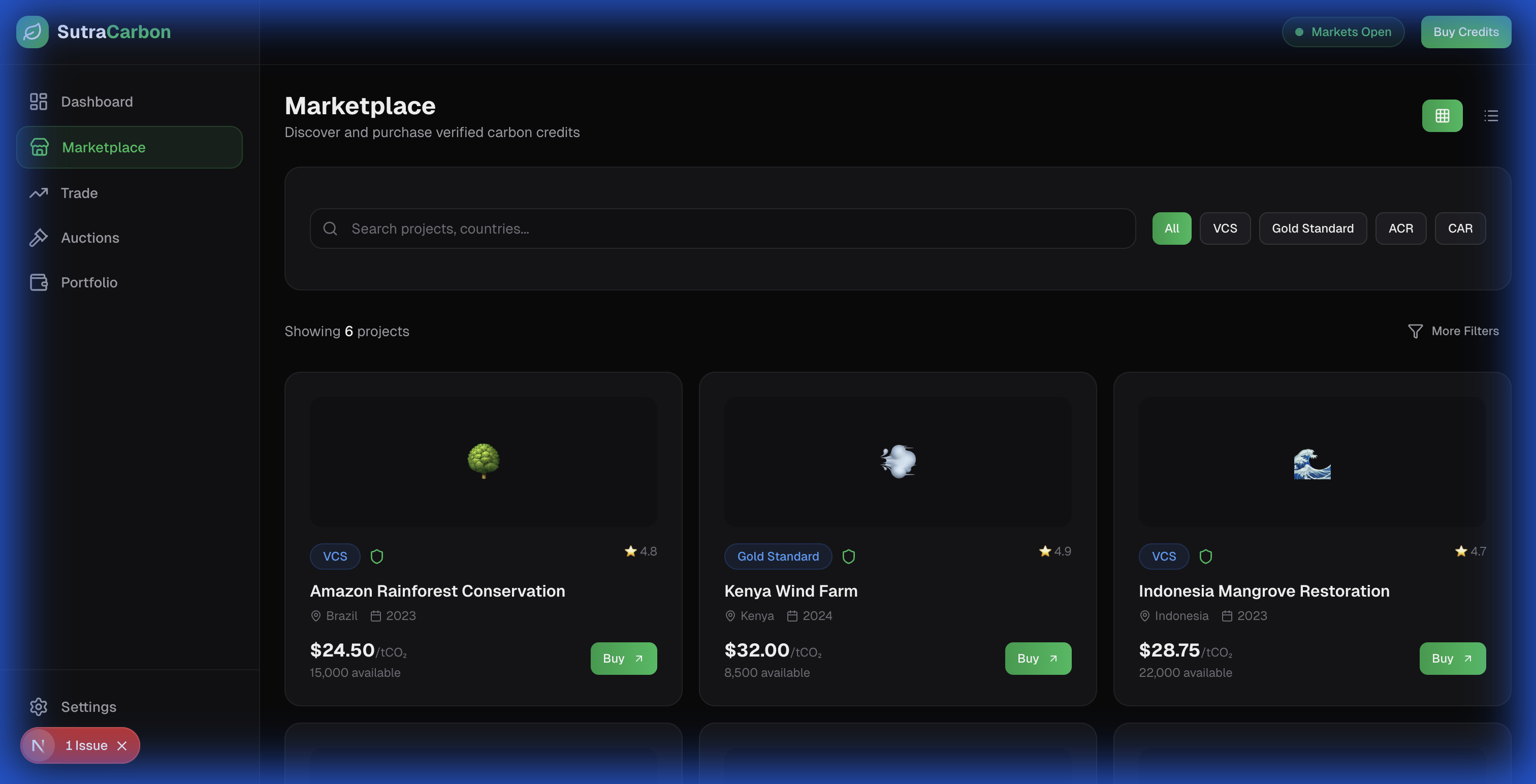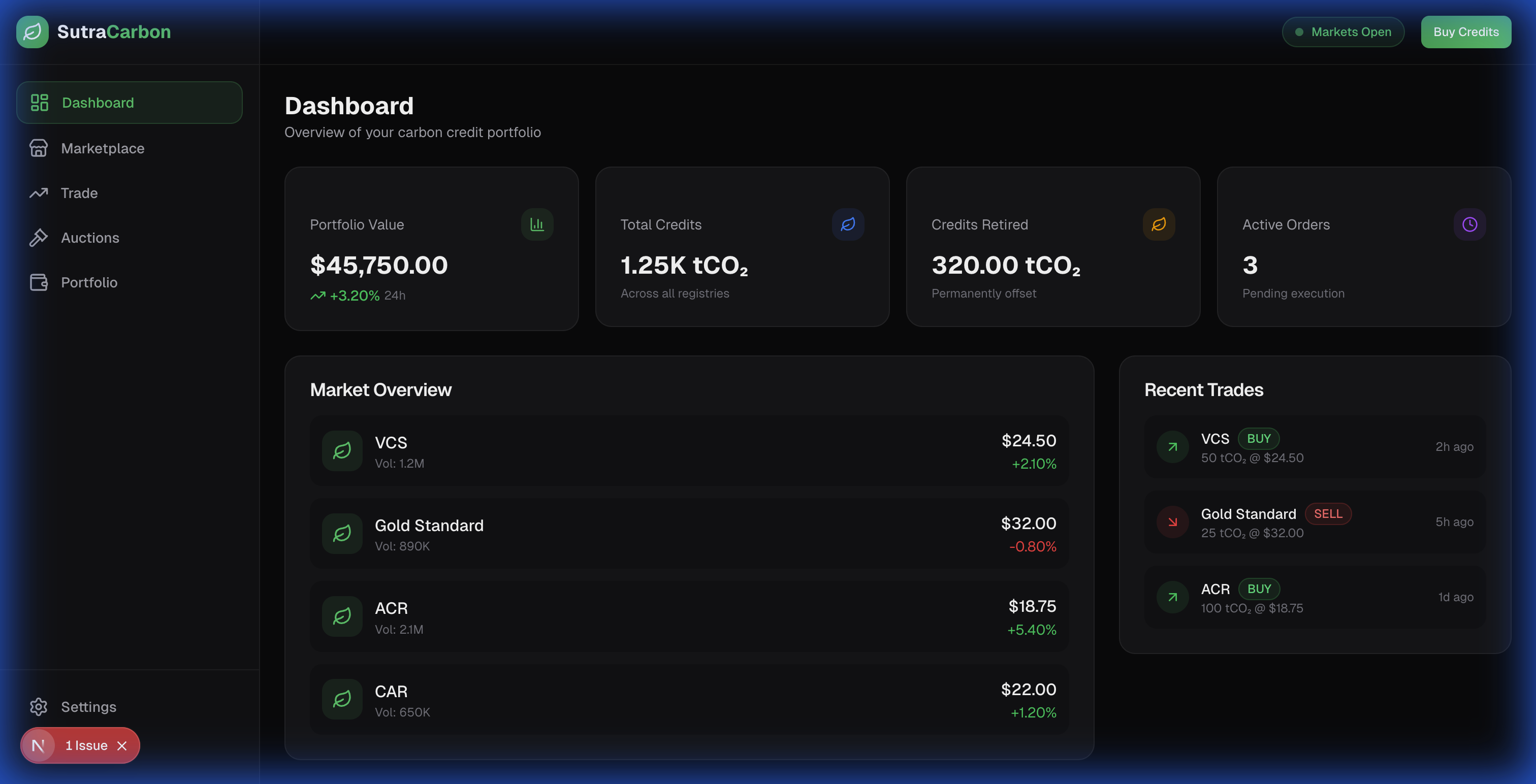 A modern marketplace for carbon credit trading with real-time order books and streamlined settlement.